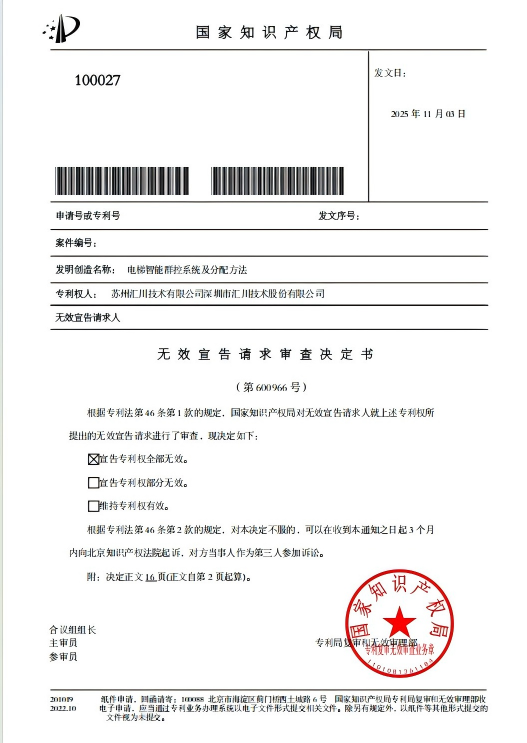 2025년 11월 3일, 국가지식재산권국은 제 600966 호 무효 결정을 발표하였습니다. 쑤저우후이춘기술유한공사 및 선전시후이춘기술주식유한공사가 보유한 "엘리베이터 지능형 군제어 시스템 및 할당 방식" 특허권에 대해 전부 무효를 선고했습니다.
