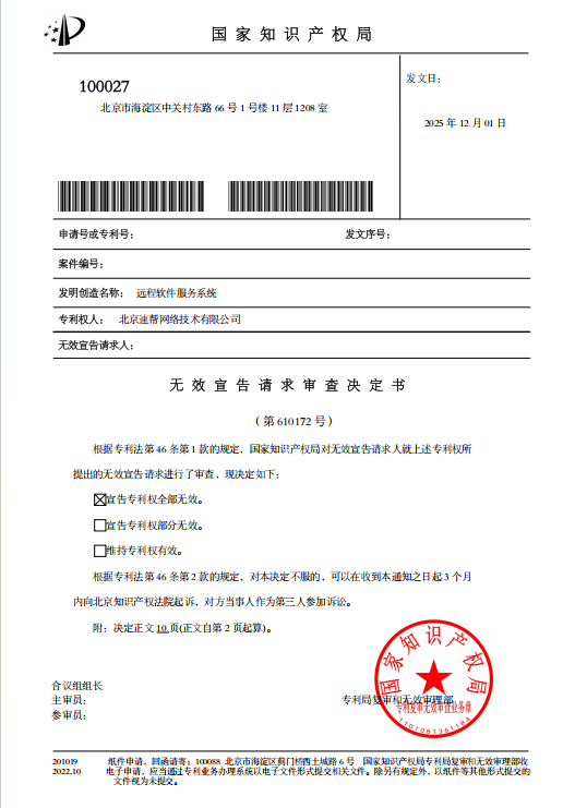 2025년 12월 1일, 중국 국가지식산권국은 제610172호 무효 결정을 내려, 북경속방네트워크기술유한공사(北京速帮网络技术有限公司)가 보유한 명칭이 ”엘리베이터 지능형 군제어 시스템 및 배분 방법”인 특허권을 전부 무효로 선고하였습니다.
